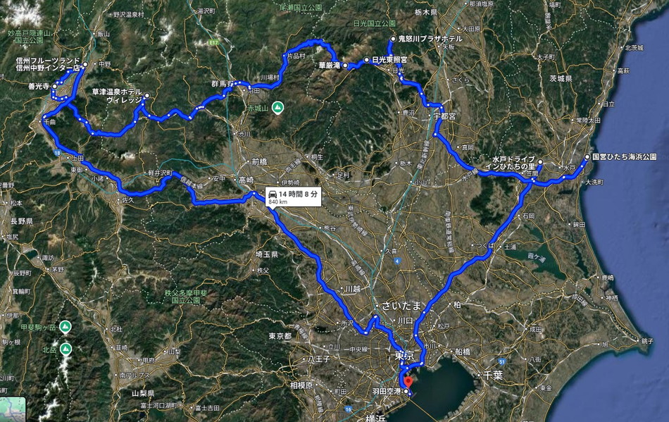 ●一日目(5/11) 【自宅】−(車移動)−【阿波踊り空港】−(飛行機)−【羽田空港】−(ツアーバス)−【水戸ドライブイン(昼食)】−(ツアーバス)−【国営ひたち海浜公園】−(ツアーバス)−【鬼怒川温泉(泊)】